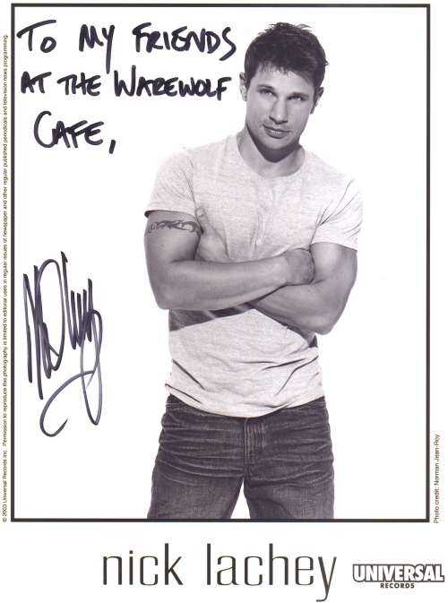 A big "thank you" goes out to Nick Lachey and all involved in getting this great picture of Nick that is autographed to The Werewolf Cafe. Nick is acting in 6 episodes on this season's TV series "Charmed." Nick's character is named Leslie (Les) St. Claire. In a recent epside this season, The Charmed Ones' (charcters Phoebe, Piper and Paige Halliwell) all turned into wolves during a blue moon (the episode was titled "Once in a Blue Moon").