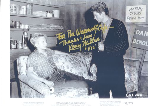 A big thank you goes out to Actor/Entertainer/Author Kenny Miller who autographed these great pictures from the movie "I was a Teenage Werewolf" that he acted in. Kenny payed the part of "Vic" in that film. Kenny has a website at http://www.celebrities-home.com/kennymiller.htm where you can find out all kinds of information about him and his various projects. Thank you so much Kenny! *Special note: there are more autographed "I was a Teenage werewolf" movie pictures that can be found in the photo archives here on this site.