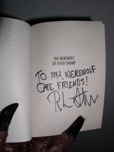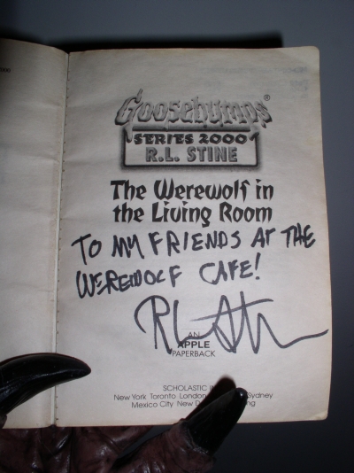 Our thanks to R.L. Stine who autographed two of his werewolf books for The Werewolf Cafe. These two books are from his "Goosebumps" series of books. You can visit the Goosebumps website at http://www.scholastic.com/goosebumps/