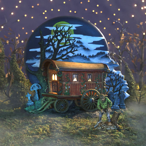 This item is from Department 56 (also called "Dept. 56") and is called "The Wolf Man's Curse". It is a set of 2 pieces, a lighted facade of a lighted gypsy caravan with a wolfman accessory piece that goes along with it.