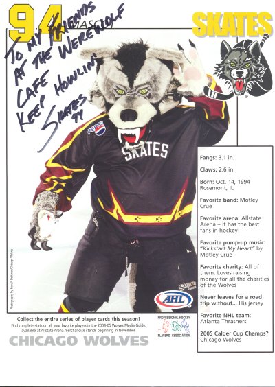 A big "thank you" goes out to The Chicago Wolves Hockey Team and their Mascot "Skates" for this great autographed picture that Skates did for The Werewolf Café. The Chicago Wolves are a great hockey team (they were the 1998, 2000 and 2002 Turner Cup Champions) and sponsor a number of charities which you can see on their website at www.chicagowolves.com (this posting is very appropriate for this site, as The Chicago Wolves have a slogan that goes "these guys are animals" and on their merchandise brochures it reads "Wear Wolves").