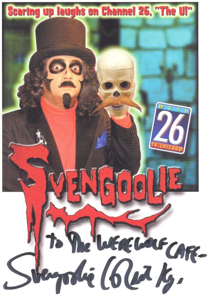 On May 22nd, we met up with Svengoolie, and he autographed his picture for this site. Svengoolie is a great Chicagoland television personality, he hosts and features horror movies during his show. If you live in or visit Chicago, please check out his program at 9 pm Saturday night shows on Channel 26 (WCIU). He's hysterically funny (and yes, he'd be your best bet to feature a werewolf movie when your looking for one to watch while in Chicago).