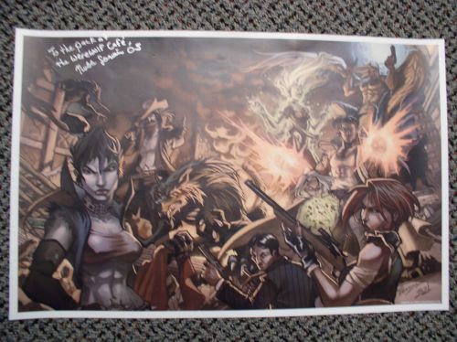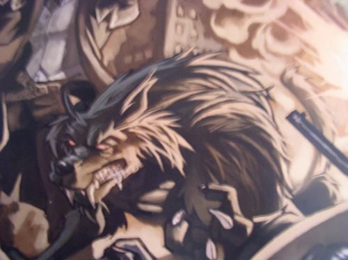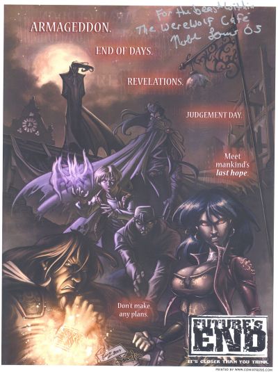 A "thank you" goes out to Noble Larimer for autographing these pictures for The Werewolf Cafe. Noble is the Editor in Chief of Ronin Studios in Altamont, Illinois and is the writer for their new comic book titled "Future's End." This comic book is currently available as a "preview" issue in the comic con circuit, the formal issue #1 should be out this August. Check out the werewolf among the characters in the artwork here. by the way, the smaller picture here (showing six characters) is the artwork from the cover of the "preview" issue. The following people worked on that issue: