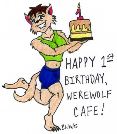 In celebration to Werewolf Cafe's first birthday party, I thought it best to have JamieD bringing in the cake. Hope you like it - the cake I mean.