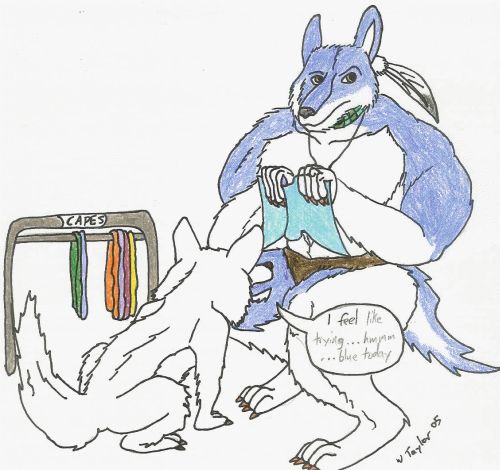Darkbluewerewolf's wolf friend has a real love for capes, leaving Darkblue in a position much like this that inspired this drawing for him! :D