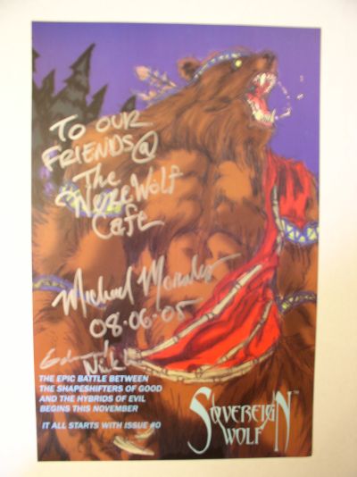 A big "thank you" goes out to Eddie Winkler and Mike Morales for autographing this "Sovereign Wolf" poster for The Werewolf Cafe. "Sovereign Wolf" is a new comic book series that will be out in November, 2005 starting with issue #0. The story line of "Sovereign Wolf" is about an epic battle between shapeshifters of good and hybrids of evil. The creative team of "Sovereign Wolf" consists of Eddie Winkler (stories & scripts) and Mike Morales (pencils, inks & colors). There is a forum for "Sovereign Wolf" here on this site where you can ask any questions about this new comic book series. Thank you Eddie and Mike!
