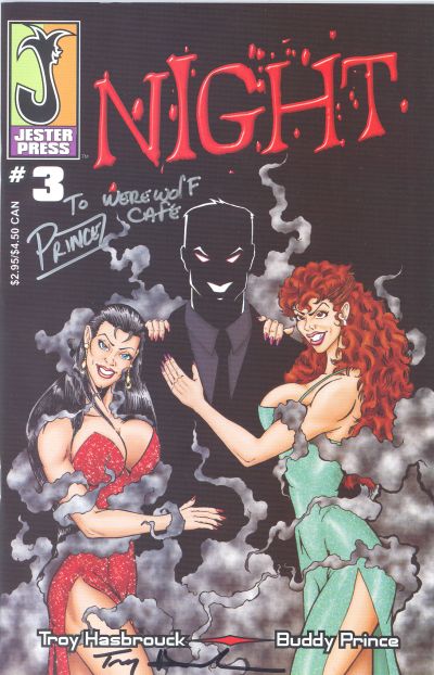 A "thank you" goes out to Troy Hasbrouck and Buddy Prince for autographing the third issue of their comic book "Night" especially for The Werewolf Cafe! This issue is the last part of a 3-part werewolf mini-series. Troy and Buddy were also kind enough to autograph the first two issues of this series for The Werewolf Cafe too, and those images can be found in the archives here. Troy and Buddy have a website at www.jesterpress.com with all kinds of information about "Night" that you can check out. Also, there is a forum topic for "Night" on this site (in the "Werewolf Books and Comic Books" forum). Thank you Troy and Buddy!