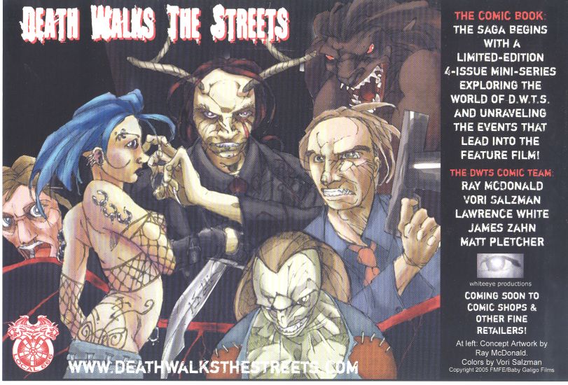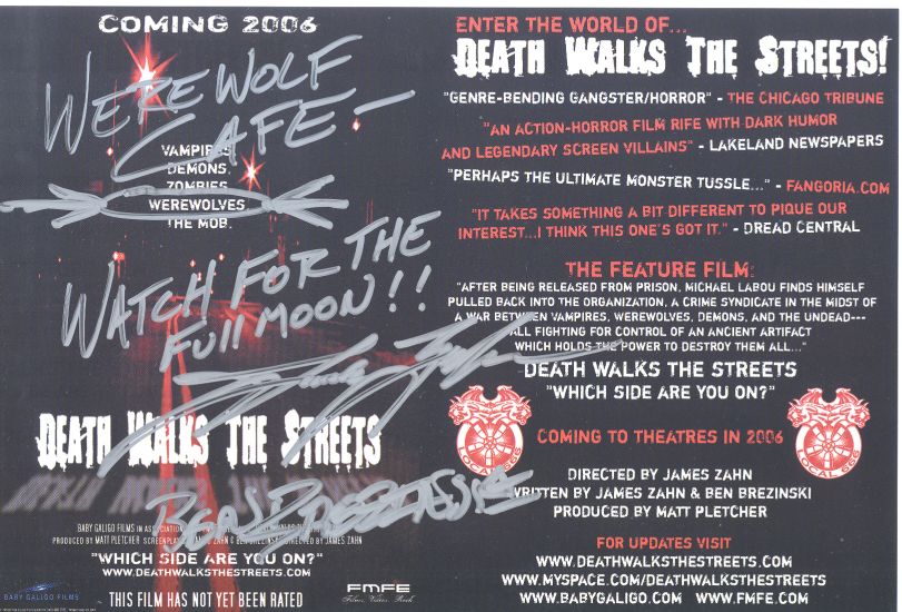 A big thank you goes out to James Zahn (Director/Co-writer) and Ben Brezinski (Co-writer) for this autographed promotional card for their upcoming movie titled "Death Walks the Streets." We want to mention that there are websites at www.deathwalksthestreets.com and at www.myspace.com/deathwalksthestreets for this film. Thank you James and Ben!
