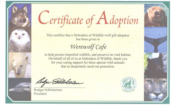 I "adopted" a Defenders of Wildlife wolf in the name of "The Werewolf Cafe." Please check out their award winning website at www.defenders.org for more information about their organization.