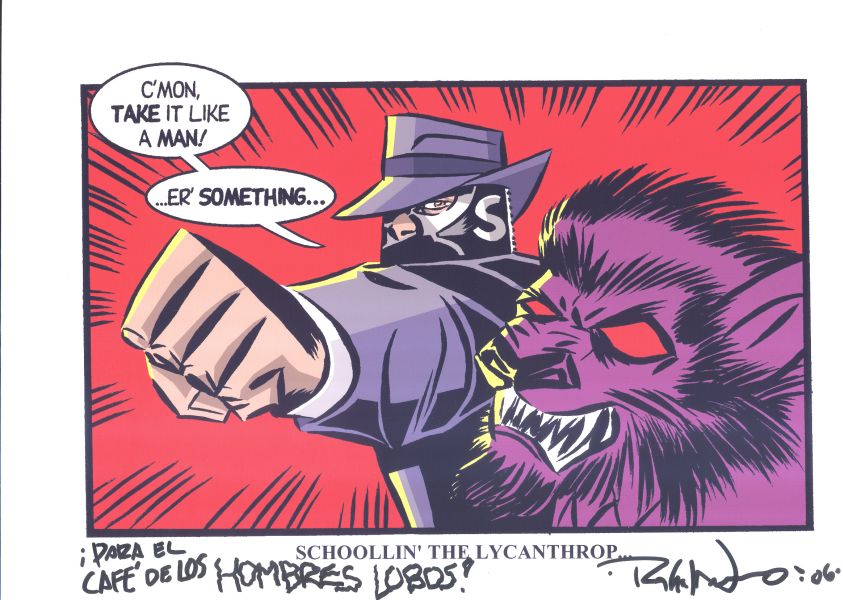 In my time with him, however, Rafael was soft spoken with no hint of violence (and comic geeks can be infuriating, trust me). He seemed genuinely pleased to speak with two comic fans at the end of a tiring three-day weekend, trading stories about traveling from one convention to the next and enthusing about the comic biz and comics in general. He seemed thrilled to hear that we liked what we saw at his booth and he acted like it was privilege to be allowed to do a quick sketch for me. I picked up a copy of his first trade and when I asked him to sign a print to the Werewolf Café, he grinned wide and decided to do it in Spanish and with scary lettering, to give it an EC comics feel. A classy guy, just like the character in his books.