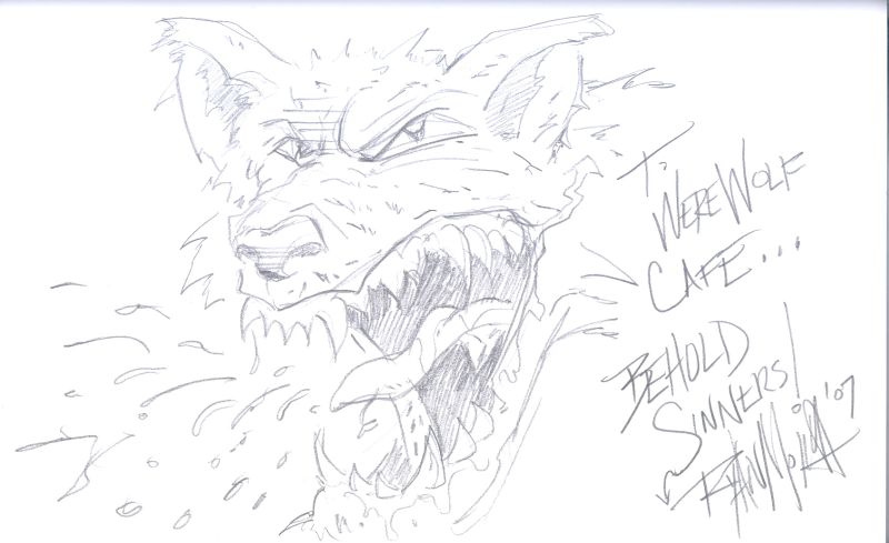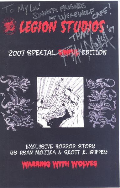 A big thank you goes out to artist Ryan Mojica for this autograghed copy of Legion Studios' 2007 convention-special ashcan titled "Warring With Wolves" that he did the story and art for, and for this werewolf sketch he did especially for The Werewolf Cafe.